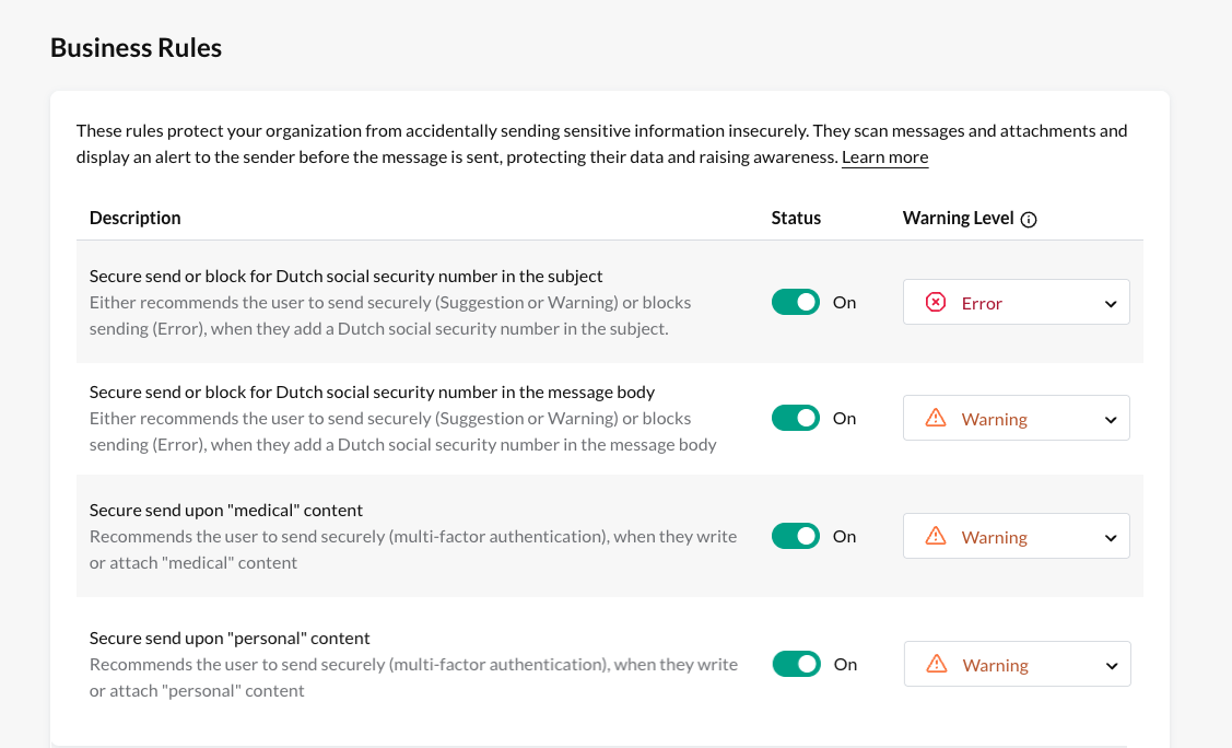 - Implement ‘security by default’ by automatically enabling secure email for sensitive information (requires Zivver configuration)