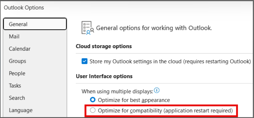 Workaround: Under File > Options > General > User Interface options select the option Optimize for compatibility and restart Outlook.