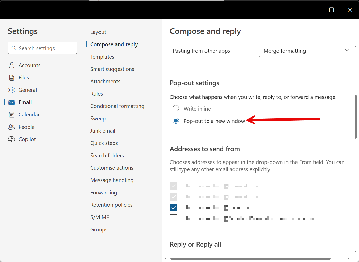 At this moment, the setting Pop-out to new window is only available in the new Outlook, not in Outlook on the web.
