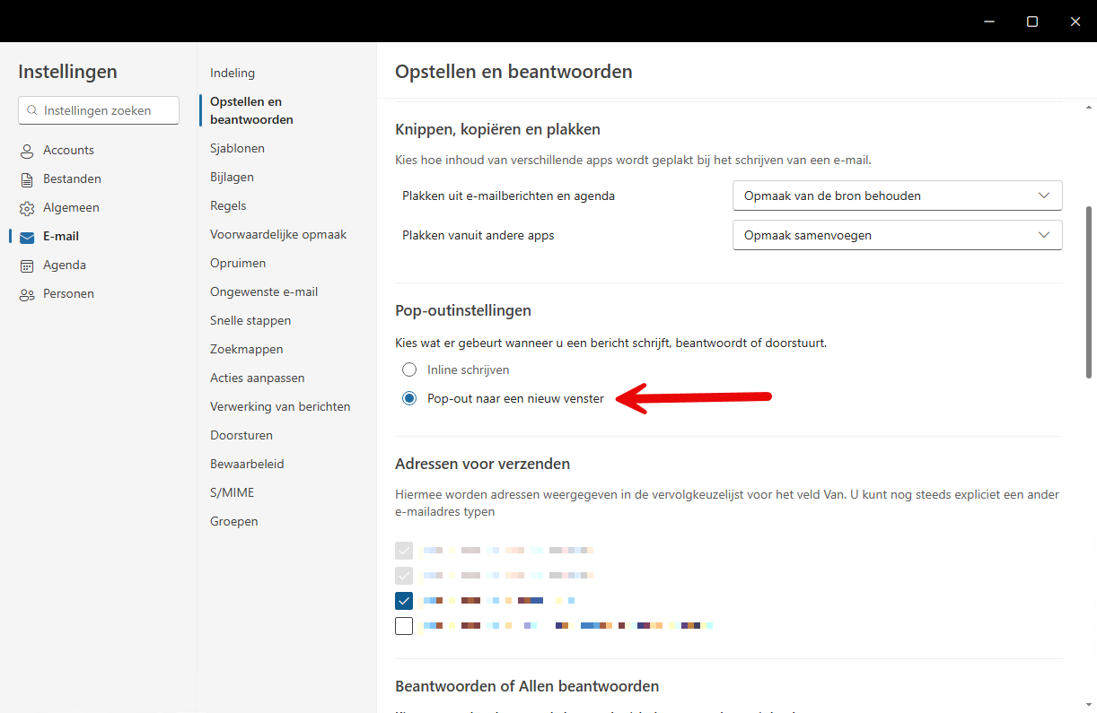 Op dit moment is de instelling Pop-out naar een nieuw venster alleen beschikbaar in de nieuwe Outlook, niet in Outlook op het web.